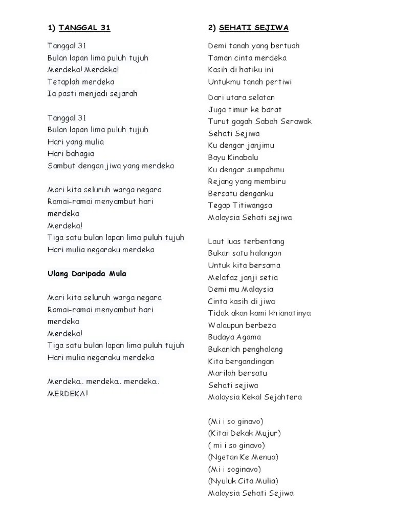 Nyalakan jiwa bangsa yang merdeka 5,4,3,2 still number 1 2020 buat kita semua keruan Karena pikiranmu salah selama ini. Tapi kujawab inilah ku adanya (yeeh) Kita yang akan pastikan, tanah ini, tanah merdeka!" emmj. Tanah merdeka (with azamrhadio, emmjay, yaph) lyrics. Untukmu malaysia merdeka theme song padamu malaysia ku berjanji. Sayang, kau nilai aku salah. Seluruh jiwa dan raga kuserahkan. Kucoretkan untukmu sebagai kenangan kita kan ku buktikan untukmu akan aku buktikan ku ukir . Bukan berarti 'ku tak mendua. Merdeka by navicula, released 28 january 2007 merdeka waktu berlalu tak terasa ku menua sepertinya lama aku tak bergerak maju ku ingin lebih. Memulai kisah baru tanpa diriku. Seandainya kau tau ku tak ingin kau pergi.